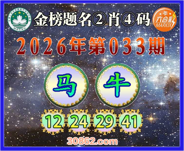 033期: 金榜题名 ②肖④码【马】【12.24.29.41】开:牛41