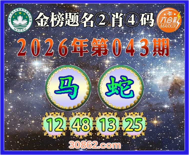 043期: 金榜题名 ②肖④码【马】【12.48.13.25】开:蛇13