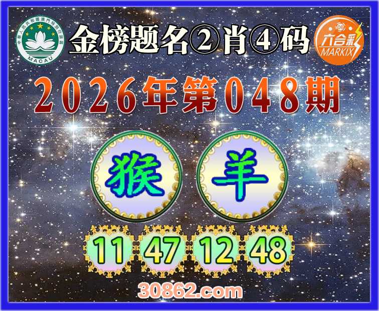 048期: 金榜题名 ②肖④码【猴】【11.47.12.48】开:羊24